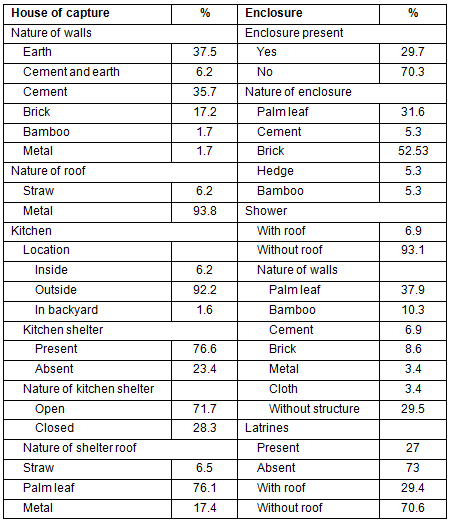 The different level of equipment led to three major habitat types being distinguished in the study area. Two extreme types could clearly be distinguished: type 1, very precarious with modest construction materials; and type 3, with hard construction materials, enclosed spaces, and covered water points. An intermediate type (type 2) was also apparent, which possessed a combination of several types of modest materials such as straw or hard (such as brick), with open spaces and uncovered water points.