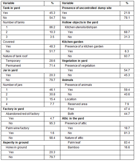 The most shared habitat elements in the 64 concessions were: the presence of a metal roof on the house (93.8%), absence of an enclosure (70.3%), a low number of discharges (uncontrolled dumpsites) (21.9%), the presence of attics (18.7%) and a low proportion of palm wine factories (1.6%) or palm oil factories (4.7%) (Tables 1,2). Similarly, certain living practices were quite common. Over two-thirds of the families left their kitchen utensils in the courtyard, which was unsurprising since the courtyard outside the home was generally used for cooking. Simple agricultural practice was rare in domestic areas. Only 6.3% of households had a kitchen garden. Crops were mainly found in the immediate surroundings around the homes but only 10% of households had cultivated fields immediately around their house. Over half of the families left the vegetation growing in their yard. The presence of banana trees in residential areas, in almost half of the households that had a garden, was particularly noted. The trees were generally found in isolated clumps and even when the household did not have a tree in their yard, it was very rare not to find at least a few banana trees in the vicinity of the house. It was common practice (92.2%) to cook outside in the courtyard with fire. When it rained, those without a shelter cooked inside their home. Open shelters with straw roofs were the most common. The showers were located outside in the courtyard, and were mostly roofless (93.1%) and made of palm leaves (37.9%).