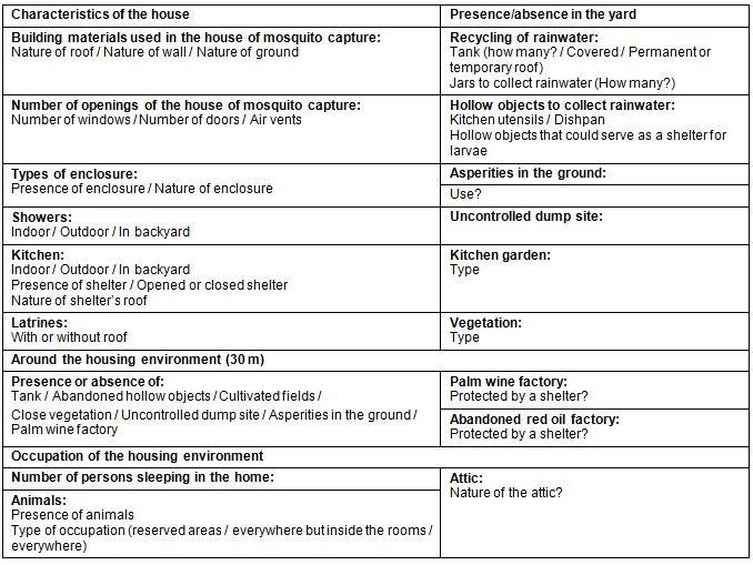 Household environment: Coding types of housing and ways of life using an itemised list is reported in an analysis grid. The social determinants that facilitate the presence of mosquitoes in the housing environment were first studied. The presence of Anopheles can be explained by two essential needs of the mosquito: feeding and reproduction. This behaviour coincides with the three phases of the gonotrophic cycle. The spatial heterogeneity of host-vector contact depends on the way in which land is used. The presence of humans, the existence of rest sites, and the availability of egg-laying sites are some of the principal reasons why mosquitoes settle in certain places. Human presence can condition vectors' choices9.
