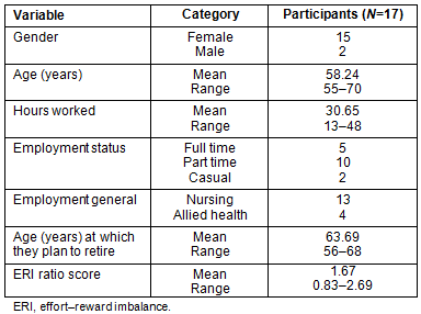 Recruitment for phase 2 involved purposeful stratified sampling procedures from the original database of 161 participants. As the data were linked, demographic and workplace variables were able to be accessed for participants. Sampling was deliberative to ensure representation of both high and low scoring participants with regard to the ERI scale reflective of the original (phase 1) cohort. Also, because the study cohort reflected the national rural health workforce with relation to gender spread and discipline mix (ie predominantly female nurses), the decision was made to over sample for males (2/17) and allied health professionals (4/17) to ensure some level of representation. This avoided an overly gendered discussion that may have focused on issues perhaps specific to nursing. The final sample largely comprised nurses (n=13; 76.5%), while the remainder of the sample were in varied positions within the allied health field (eg social worker, physiotherapist, diabetes educator, and aged care services co-ordinator), reflecting the structure and composition of Australian public hospital system41. Table 1 displays participants' descriptive statistics obtained, including demographic data, employment status, potential retirement age, and ERI score. Any ERI ratio score over 1 indicates the presence of effort-reward imbalance.