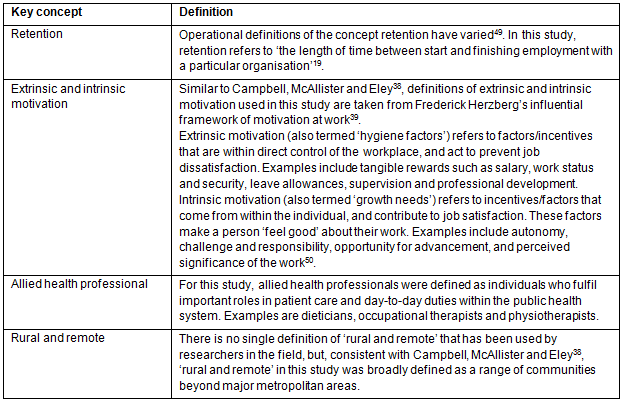 Awareness of the current and impending workforce crisis has led to a number of policy responses11, and a considerable body of literature devoted to the retention of rural healthcare workers and healthcare workers more generally15-17. Although much progress has been made concerning ways to best deal with the impending workforce demand and shortage facing rural communities, as outlined below, critical gaps in research knowledge remain. These gaps relate to the lack of health workforce retention research that has taken into account specific health professions (eg nurses and allied health professionals) or certain geographic locations (eg rural areas), or particular age groups (eg older workers). Additionally, little is known about retention strategies specific to older rural nurses and allied health professionals, and there is a dearth of qualitative research, grounded in theory, focused on health workforce retention.