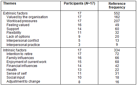 Intrinsic factors are those that participants were most able to influence and adjust themselves, not necessarily affected directly by the workplace. They are still important considerations in terms of retention. Factors here included: intention to retire, family influences, work enjoyment, financial influences, health, sense of self, social input, and adjustment to change.
