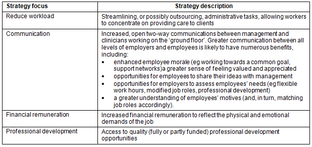 There are also unanswered questions concerning effective retention strategies for older rural nurses and allied healthcare workers. Outcomes from existing research have identified various retention strategies, yet very few studies have evaluated the effectiveness of any particular strategy19,26,27. With regard to retaining older workers, outcomes from general workforce literature highlight the need for organisations to reorient workforce strategies, including the organisation culture and management practices, to capitalise on and retain their older workforce27. Similarly, qualitative nursing workforce literature in the UK and USA identifies a range of factors influencing older nurses' decisions to remain in the workforce, despite numerous job stressors faced on a daily basis. These factors include (although are not limited to) altruistic reasons (eg caring nature, job satisfaction), flexible hours, and professional development28,29. Thus, on the basis of available evidence, there is no 'one size fits all' approach to retention strategies. Rather, it seems that what is needed is the development and prioritising of 'bundles of strategies' that are individual-, discipline- and geographic location-specific, to ensure retention of different healthcare workers in different settings12,19,21,26.