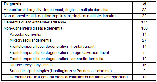 All patients in the sample were diagnosed with a cognitive impairment resulting from single-domain or multi-domain amnestic (aMCI), non-amnestic mild cognitive impairment (non-aMCI), dementia due to Alzheimer's disease (AD), or non-AD dementia (various etiologies). Not surprising, almost half of the sample (43.8%) had a diagnosis of AD. Summaries and frequencies of diagnoses of the patient sample are shown in Table 1.