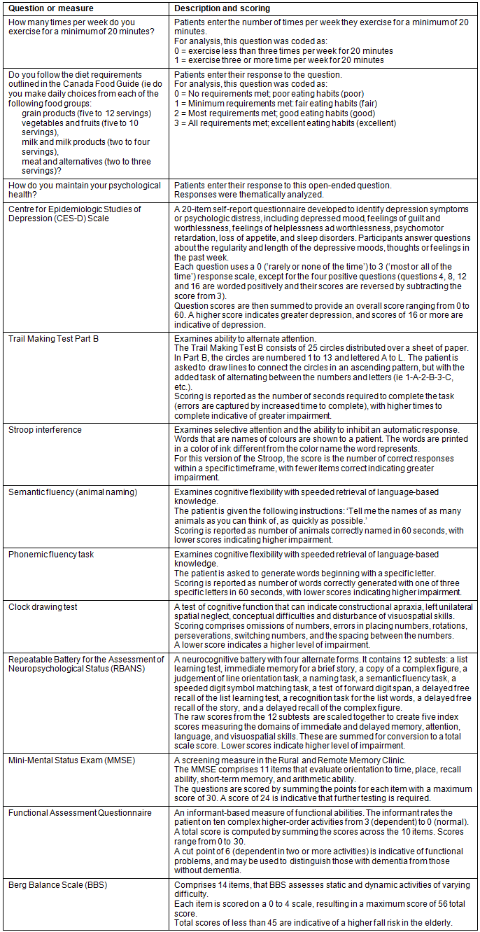 Patient and caregiver questionnaires and assessments administered at the RRMC clinic day appointment14 provided the sociodemographic data including age, sex, years of formal education, and health and wellness behaviors and lifestyle data. Regarding exercise and nutrition (eating well) behaviors, patients answered two specific questions: 'How many times per week do you exercise for a minimum of 20 minutes?' and 'Do you follow the diet requirements outlined in the Canada Food Guide [Canada's Food Guide to Healthy Eating]?'17. Canada's Food Guide to Healthy Eating provides general information about the number of servings from each food group - grain products (5-12 servings), vegetables and fruit (5-10), milk products (2-4) , and meat and alternatives (2-3) that Canadians should consume17. Canada's Food Guide to Healthy Eating has a total diet approach to choosing foods. The total diet approach aimed to meet both energy and nutrient requirements, recognizing that energy needs vary based on age, body size, activity level, sex and specific conditions, such as pregnancy and breastfeeding17. Regarding psychological health and wellbeing behaviors, patients answered an open-ended question: 'How do you maintain your psychological health?'
