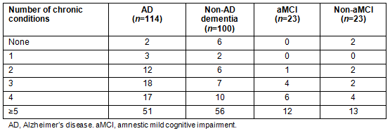 Table 3 shows the frequency counts of chronic diseases for the aMCI, non-aMCI, dementia due to AD and non-AD dementia diagnostic groups. Almost half (45.8%) of those with dementia due to AD reported having five or more chronic conditions. For those with non-AD dementia, 56% reported having five or more chronic conditions. A similar pattern was seen with the MCI diagnostic groups, with 52.2% of those with aMCI reporting five or more chronic conditions and 56.2% of those with non-aMCI reporting five or more chronic conditions.