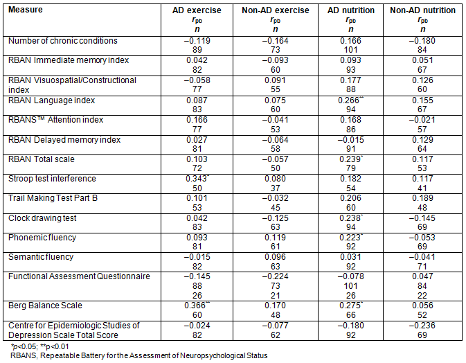 Table 4: Associations between lifestyle variables of regular exercise (higher score coded for more exercise) and nutrition habits (higher score coded for reported greater adherence to Canada's Food Guide to Healthy Eating) for neuropsychological, functional, physical, and mood measures for the dementia due to AD or non-AD dementia groups
