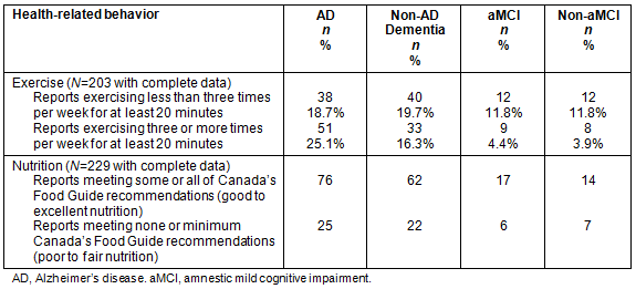 Table 5 illustrates exercise and nutrition habits for the aMCI, non-aMCI, dementia due to AD and non-AD dementia diagnostic groups. Except for the AD group, more than half of the other groups - aMCI (57.1%), non-aMCI (60%) and non-AD dementia (52.9%) - reported exercising for 20 minutes less than three times per week. Less than half (42.7%) of the AD group reported exercising for 20 minutes less than three times per week. Importantly, over a third (39.4%) of the total sample reported not exercising at all on a weekly basis and the vast majority (97.5%) reported weekly exercise less than 150 minutes weekly, the minimum amount for adults and older adults according to the Canadian Society for Exercise Physiology31. Of the 229 respondents with complete questionnaire data, about three-quarters (74%) of individuals reported they met most or all of the Canada's Food Guide to Healthy Eating dietary recommendations17. Three-quarters (75.2%) of the AD group, 73.8% of the non-AD dementia group, 73.9% of the aMCI group and 66.7% of the non-aMCI (60%) group reported meeting most or all of the Canada's Food Guide to Healthy Eating dietary recommendations17.