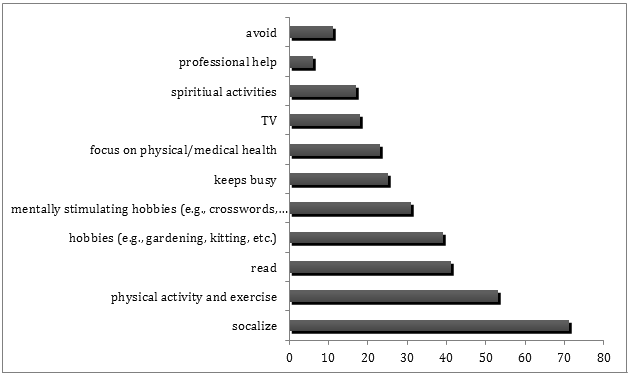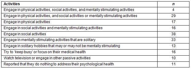 More than two-thirds (71%) of respondents indicated they were engaged in wide variety of activities to maintain their psychological health (Table 6). Many of the 187 participants who reported engaging in activities to maintain their psychological health reported more than one activity. However, a very small number (2.1%) reported engaging in a combination of physical activities, social activities, and mentally stimulating activities. About 20% of the sample reported engaging in passive activities or did not engage in any activities to maintain their psychological health. The types of activities the sample reported engaging in to maintain psychological health are depicted in Figure 1.