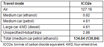 Two trips involved stops at rural airports unavailable in the mileage calculator library12, thus distance information was unavailable. One trip was to Ballarat in regional Victoria. In this instance, the emissions calculated for a trip of lesser distance from King Island to Moorabbin airport, Melbourne, were used. The second trip involved a stopover at Shepparton, en route to Brisbane. In this instance, the routes King Island to Moorabbin airport, and Moorabbin to Brisbane, were used as an overall equivalent distance, with the fuel burn associated with two take-offs and landings included.