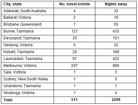 The travel data described the total journey, known as the travel event, and included destinations for each leg of the journey and the mode of transport taken for each leg. For distances of more than 50 km travelled by road from the destination airport to health services, the road travel was included in calculations. Distances from the airport than 50 km were not included, being considered usual for metropolitan or outer urban residents. For example, for attendance at Sandringham Hospital, Victoria, flights for King Island to Melbourne return were included, whereas attendance at Geelong included return flights to Melbourne plus the return road trip to Geelong. Similarly, attendance at the Mersey Hospital, Tasmania, included flights to and from Wynyard, while attendance at Launceston Hospital included flights to and from Wynyard plus the return road trip to and from Launceston if this was the route taken. This information was used to calculate how much travel residents of King Island conduct in excess of what is usual for metropolitan or outer urban residents, and also the carbon emissions associated with the fuel burned in tonnes of carbon dioxide equivalent (tCO2e).