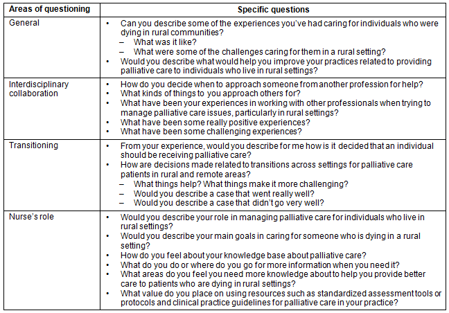 Once a consent form was signed by each nurse who was willing to participate in a follow-up interview, a telephone interview was scheduled. A trained interviewer conducted the interviews with each nurse (N=21), using a semi-structured interview guide. Questions focused on eliciting information on the nurses' experiences of providing palliative care to rural clients living in the community (Table 1).