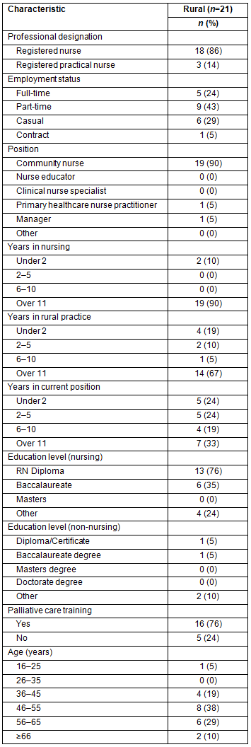 All of the participants were female, with 90% Registered Nurses and 10% Registered Practical Nurses (Table 2). Almost half of the nurses worked part-time (43%) and the majority worked directly with clients (90%). Two-thirds had over 11 years of rural nursing experience and 77% were over 46 years of age. The majority (76%) reported that they had received some training in palliative care.