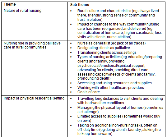 In summary, the findings from this study add to the growing body of literature on the experiences of nurses working in rural communities in terms of the provision of palliative care and the influence of the physical residential setting there. Nurses described their experiences of working in a rural community and, more specifically, their role in providing palliative care to clients dying in rural communities. These findings are important since nurses have a major role in caring for community-dwelling clients who are dying, but they are confronted with many obstacles along the way. As such, these results should help inform future decisions on how to improve rural residents' access to important palliative services and ways to support them work within the rural community.
