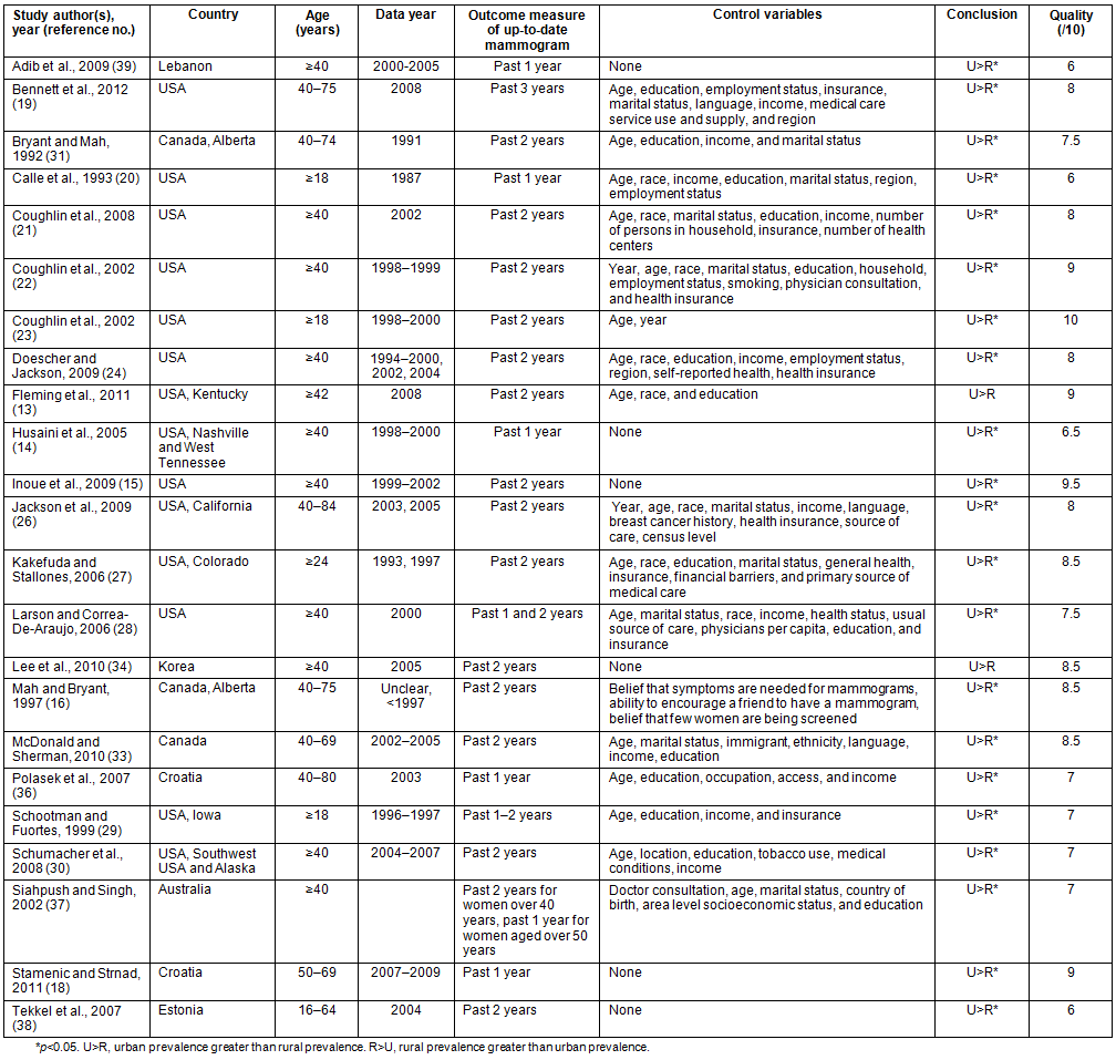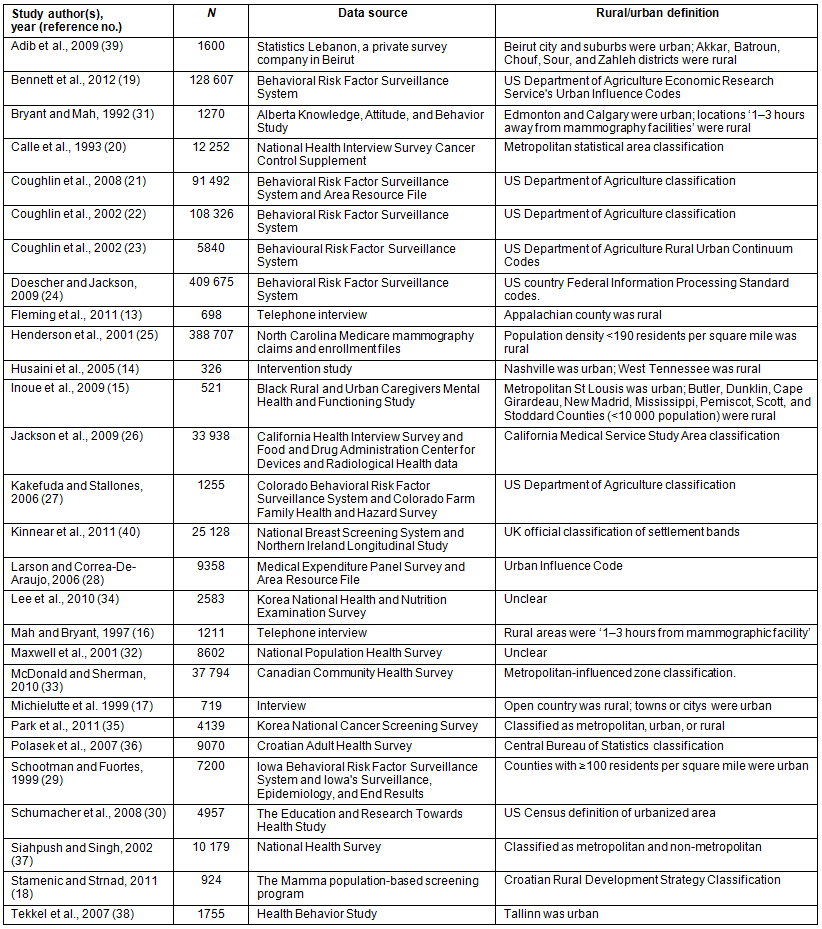 There were 23 studies that compared the prevalence of up-to-date mammography service use between the rural and urban populations (Table 3). Most of the studies defined 'up-to-date' as having had a mammogram in the past 1 or 2 years. One study compared women who had a mammogram in the past 3 years19. All studies observed that women residing in more urban areas were more likely to have an up-to-date mammogram than women residing in more rural areas.