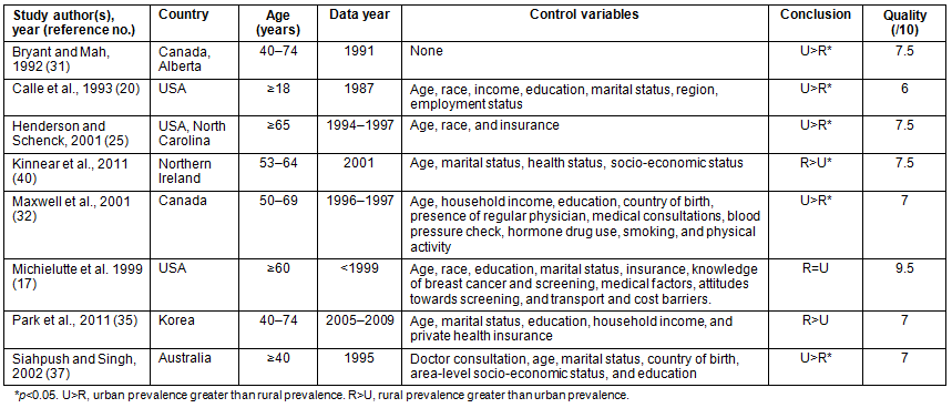 Table 3: Studies comparing the prevalence of 'up-to-date mammogram' between the rural and urban populations
