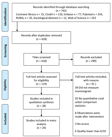 Studies to be included underwent assessment by two independent reviewers (JL and SM). Where discrepancies existed between the reviewers, papers were referred to a third reviewer (DM). Studies were included in the systematic review if they met the following eligibility criteria: (1) the population included adult women; (2) the outcome measure was clinic record or self-report of mammography; (3) quantitative statistics of rural versus urban comparisons were present; (4) the study included an observation on the screening rates in a non-intervention sample; (5) quality was 6/10 or higher, based on the assessment described below. Cross-sectional studies were included. Baseline cross-sectional observations from intervention studies before the intervention had been carried out are included. Studies were included in the meta-analysis if required statistics were available.