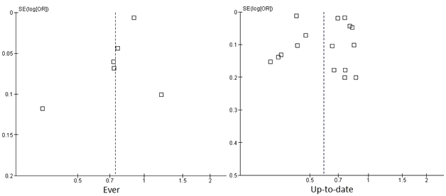Figure 2: Funnel plot of the six studies included for the outcome of 'ever had a mammogram' and the 16 studies included for the outcome of 'up-to-date mammogram'.
