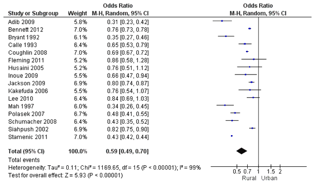 A number of limitations should be considered when interpreting the findings of this paper. Firstly there is heterogeneity among studies, although this is to be expected because of the diversity of study settings. However, the meta-analysis results were consistent with the systematic review findings, and so the observed heterogeneity was unlikely to change the interpretation of the findings. While there are criticisms of wide variation of the definition of 'rurality' in previous research9, in the current review, most studies employed a national level standard definition. Internationally, the standard classification methods of rurality were similar and were commonly based on distance to major service areas and population density.