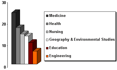 While the level of activity is modest, the extent to which it is distributed among disciplines is encouraging, and appears to reflect an on-going commitment. Faculty in 12 distinct fields report they are currently, or have previously, supervised students performing research on pertinent issues. In fact, when previous students' work is taken into account, the cumulative level rises to an encouraging point (21.2% of programs) - and reinforces the message that students will find support in pursuing a rural health focus in their research education.