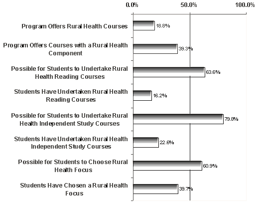 In those areas of curricula shaped by student choices, however, rural content is a viable option. Reading courses and independent study courses in 63.6 and 79.8% of the programs, respectively, may be tailored to cover rural topics. Relatively few students do so, however: approximately 16.2 and 22.6%. However, overall, respondents from six out of every 10 programs felt that students could achieve a rural orientation in their studies.