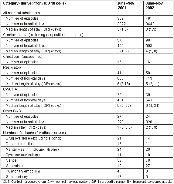 Episodes of care and length of stay for all admissions and a selection of the common diagnostic categories for the periods June-November 2001 and 2002 are shown (Table 1). There was a 25% rise in total admissions between the time periods, with particular increases in cardiovascular and cerebrovascular disease, and cancer. Air ambulance transfers between the islands and the mainland within these time periods also increased by 31%, from 88 to 115 transfers.