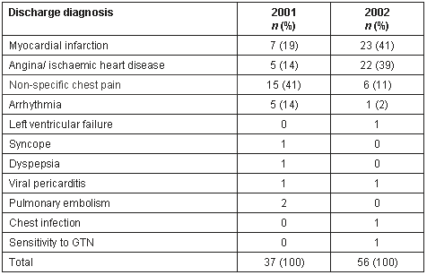 The discharge diagnosis is shown for those patients considered eligible for the ICP on the basis of the presenting complaint, as recorded in the medical notes (Table 2). A considerably greater proportion of patients in 2002 had myocardial infarction or angina as the recorded discharge diagnosis, compared with 2001, where a greater proportion were classified as non-specific chest pain. The reasons for this are uncertain, but the most likely explanation is diagnostic transfer, that is the use of different terminology as the practitioners became more confident of making a diagnosis of cardiac chest pain.