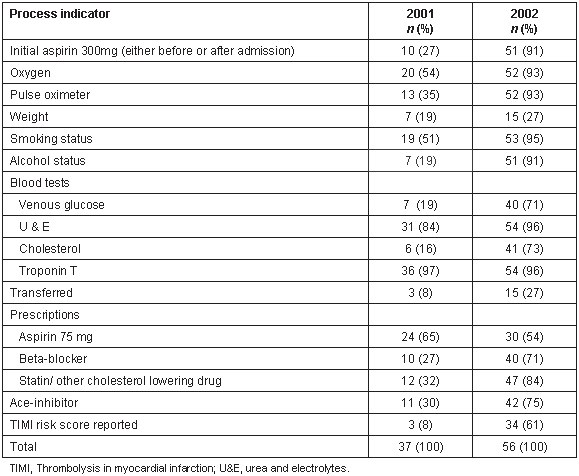 The recording of key process indicators for patients considered eligible for the ICP in 2001 and 2002 is shown (Table 3). The recording of specific details from the history and frequency of appropriate blood investigations increased, and initial steps in management changed considerably after introduction of the ICP.