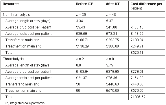 Costs associated with resource use are summarised (Table 4). In the non-thrombolysis arm of the pathway, there was a significant increase in average length of stay but no cost was attributed to this because the hospital occupancy (69%) allowed the increased bed days to be accommodated without additional resources. The increase in drug cost was largely attributable to a greater use of pathway-recommended treatments; heparin accounted for 62%, statins for 9%, and clopidogrel for 20% of the increase. Use of ACE inhibitors and β-blockers also increased but the cost implications were much smaller. Increased use of chest X-rays accounted for approximately 75% of the cost difference for tests. The largest differences in cost arose from increased transfers to the mainland teaching hospital. Although absolute numbers were small, the unit costs for air ambulance transfers and for treatment in the teaching hospital were high. In the thrombolysis group, differences in resource use were mostly non-significant because of the very small sample size. The exception was the cost of tests. The same pattern of increased resource use was observed, except for a (non-significant) reduction in average length of stay. The large increase in drug costs was mainly due to the substitution of a more expensive thrombolytic agent.