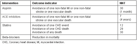 Costs per patient treated were used to estimate the annual impact of the pathway. For an estimated 100 patients per year (85 non-thrombolysis; 15 thrombolysis), the additional cost would be £64 000, of which over 80% is accounted for by air ambulance transfers and treatment in the mainland teaching hospital. Tables 5 and 6 summarise evidence from the literature presented as the number of patients that need to be treated (NNT) with each intervention to achieve the health outcome indicated. Note that no figure is shown for β-blockers. Although this intervention benefits patients, no suitable data could be found for NNT that related to these specific patient groups. As a result, no benefit was included. A consistent approach was adopted to apply assumptions that will produce conservative estimates of benefit. From the increase in intervention rates shown in Table 3, estimates were made of the number of adverse events avoided on an annual basis, based on 100 patients per year (85 non-thrombolysis; 15 thrombolysis). Approximately 16 adverse events would be avoided at a combined cost of £212 000 (£148 000 direct costs of intervention plus £64 000 additional treatment costs) or £13 250 per event avoided. This is a conservative estimate of benefit because all the direct costs of the intervention have been included, even though the investment in medical services would benefit other groups of patients as well.