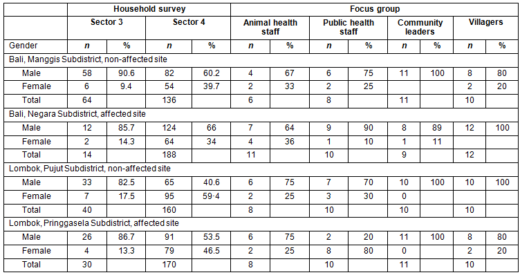 At each island's two study sites, four focus groups were conducted separately with community leaders, villagers who owned poultry, animal health agencies and human health agencies. Each focus group consisted of 8-10 participants and lasted 1-2 hours. In Lombok, there were 79 participants in the eight focus groups: 41 participants from the affected site and 38 from the non-affected sites. In Bali there were 77 participants in the eight focus groups: 42 from the affected site and 35 from the non-affected site.
