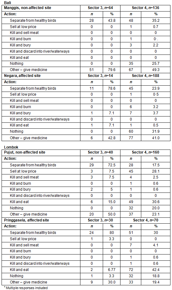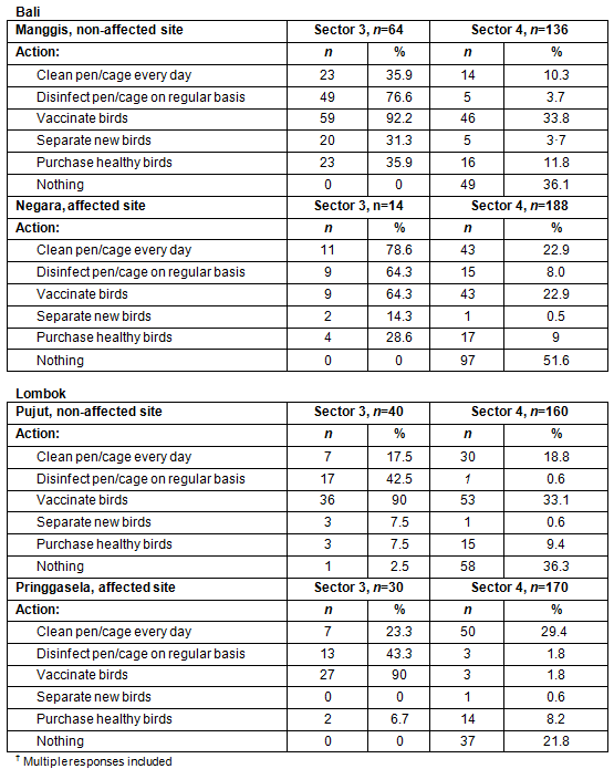 Vaccination and biosecurity: Government policy in Indonesia is that vaccines for poultry must be purchased by owners - the government does not supply vaccine for any diseases. While bird owners may vaccinate against some bird diseases, they do not necessarily vaccinate against HPAI. On Bali, 92% of Sector 3 respondents and 34% of Sector 4 respondents in Manggis reported that they vaccinated their birds, while 64% of Sector 3 and 23% of Sector 4 in Negara reported doing so. Thus, vaccination rates were actually lower in the subdistrict that had experienced a human HPAI case. On Lombok, Sector 3 respondents who reported vaccinating their birds varied from 10% (Pujut Subdistrict) to 90% (Pringgasela subdistrict) and in Sector 4 from 33% (Pujut) to 25% (Pringgasela) (Table 2).