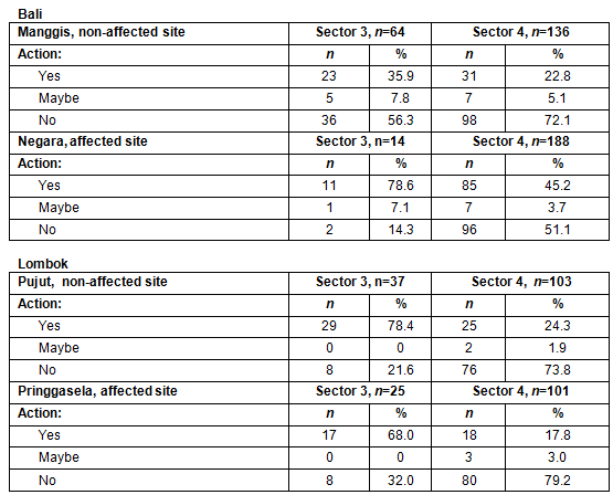 On Bali, from the survey, 103 of 188 (55%) of Sector 4 respondents in Negara (affected site) and 49 of 136 (36%) of Sector 4 respondents in Manggis (non-affected site) were aware of HPAI prevention activities in their village. For Sector 3 respondents, these figures were 11/14 (71%) and 41/64 (64%). On Lombok, only 9 of 330 (3%) of Sector 4 and 8/70 (11%) of Sector 3 respondents were aware of such activities.