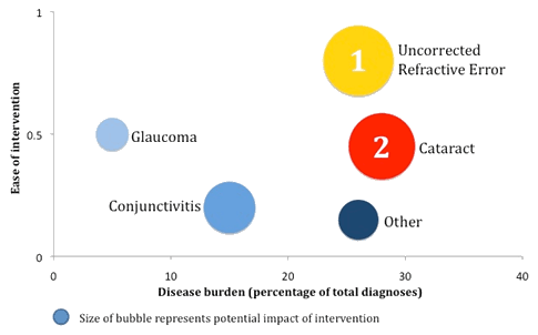An attempt was made to rationalize the priorities for the eye strategy. Priority was determined based on three factors: potential impact on visual acuity, ease of an intervention and disease burden (Fig1). This was particularly important given the limited resources available. We defined a high impact on visual acuity occurring if the visual acuity could be improved significantly by an intervention. Thus interventions such as correcting refractive error and cataracts were given high impact scores since they can improve acuity to normal/near-normal levels. In contrast, adequate treatment of glaucoma can prevent ongoing visual loss but does not restore vision loss that has already occurred due to glaucoma. Ease of intervention was determined based on both the resources required and the impact on a patient's lifestyle. Correction of refractive error was determined to be relatively 'easy', since this requires spectacle correction only. This is non-invasive and can be performed by optometrists and technicians, particularly given recent advances in autorefractor technology and ready-made spectacles5. Cataract surgery requires surgical expertise and equipment, but is a single quick procedure that can be performed in a cost-effective manner. In most cases glaucoma can be managed with long-term use of topical medications, but this is a chronic disease requiring regular intraocular pressure checks and dilated assessments of the optic nerve head.