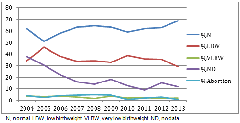 Figure 1: Trends in birthweight as percentage of total births, Gudalur Adivasi Hospital (Ashwini hospital), 2004-2013.