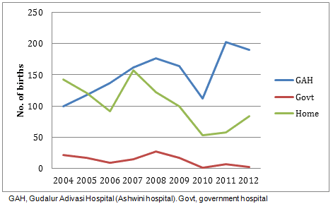We defined weight according to WHO standards: normal (>2.5 kg), low (<2.5 kg) or very low (<1.5 kg); additionally, we commented on those with no data. Our main research question was about whether an improvement in birthweights, overall and by tribe, had taken place during the time in which Ashwini (Association for Health and Welfare in the Nilgiris, which runs and staffs Gudalur Adivasi Hospital and outreach services for Scheduled Tribes within the catchment area) has provided health care to these tribes. As a secondary focus, we analysed the trend in delivery location, because institutional deliveries have been strongly encouraged by the Indian government, especially in rural communities, under the Janani Surakshan Yojana Programme5.