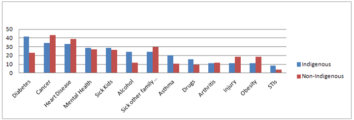 Three hundred and eighty participants completed the survey, 48% were male; 18.4% identified as an Indigenous person and 21% worked in the local mining industry. Men's and women's health priorities were generally similar but women prioritised 'sick kids' first, while men prioritised heart disease first (χ² =28.75 df=12 p=0.004). Ranked second for both genders was cancer. Third ranked for women was mental health issues, while for men mental health issues and diabetes were ranked equal third. The top three health concerns for Indigenous people were diabetes (41.4%), cancer (34.3%), and heart disease (32.9%); whereas for non-Indigenous people these were cancer (43.4%), heart disease (38.7%), and sick family members (30%) (Fig1). Approximately one-third of Aboriginal women identified alcohol misuse as a priority (32.4%) compared with non-Aboriginal women (6%). This was significantly different (χ²= 19.45 df=1 p=0.001). More than half the Aboriginal men identified diabetes as a priority (53%), compared with 24% of the non-Aboriginal men. This was also significantly different (χ²=10.04 df=1 p=0.002). No Aboriginal men identified injury as a health concern.