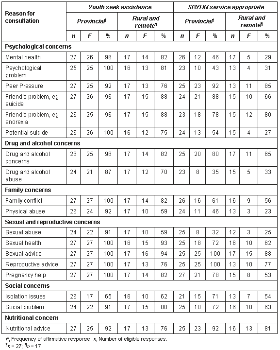 The final instrument consisted of six sections. Areas addressed in this paper include demographic information; youth health concerns; youth health service provision in provincial, rural and remote areas; accessibility and availability of services; appropriateness of the SBYHN in addressing health concerns; and management of health concerns when services are unavailable.