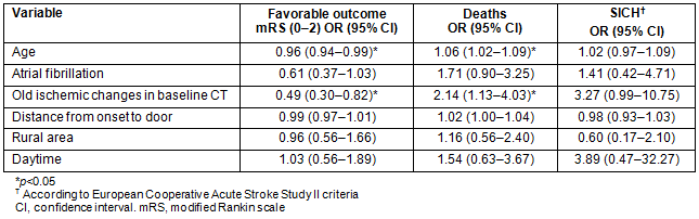 A multivariate analysis showed no impact of place of onset on favorable outcome after 3 months (p=0.9), on the presence of SICH (p=0.43) according to the ECASS definition or on mortality rate (p=0.69).