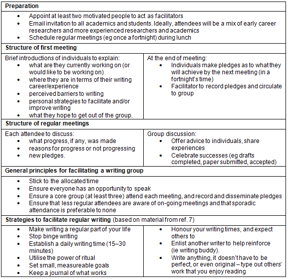 Members of the Wiljo-Piri Writing Group will continue to honour their commitment to their writing routine, and also to write with their buddies. Fortnightly meetings, which had stopped for some months, have recommenced, with the aim of maintaining motivation in the wider group, providing peer support, and encouraging other staff members to 'buddy-up'. Effective writing interventions often require at least one academic years' duration6, so ongoing commitment is required to further entrench the culture of routine writing in this group of rural early career researchers. Table 1 is a guide, including suggested format and principles, to setting up a writing support group.
