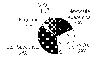 Figure 1: Distribution of staff who taught 322 scheduled teaching hours of the 4th year program in Tamworth in 2002. VMO, Visiting medical officer.