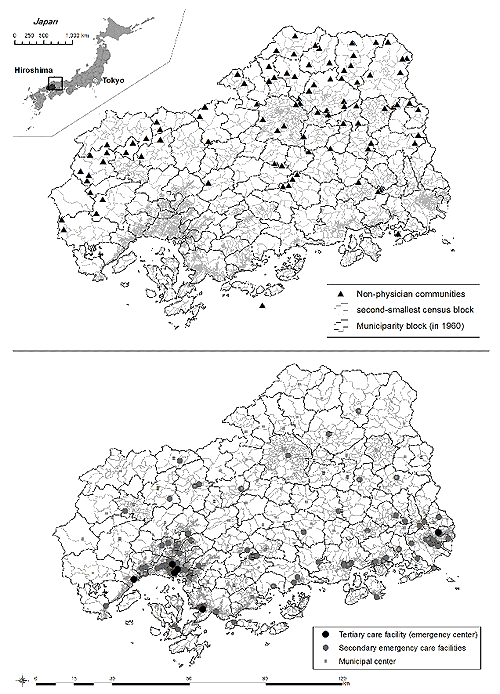 The authors would like to thank Jinseki-Kogen Town, Hospital Director Dr Wataru Harada, and the staff at the Jinseki-Kogen Municipal Office for their support of this study. We also appreciate the assistance from the staff of the Health and Welfare Affairs Bureau, Hiroshima Prefectural Government, in providing the medical facilities data. The software used in this study was supplied by the Higher Education Grant Program of ESRI Japan Corp. (Tokyo, Japan).