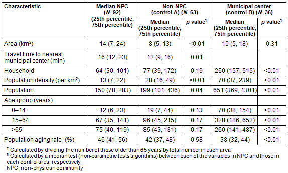 Table 2 shows geographic and demographic characteristics of NPCs and two types of control communities. The NPCs had a lower median population density than both types of controls (13 persons per km2 (NPC) vs 28 (non-NPC) and 70 (municipal center)) and a higher elderly rate (≥65 years) (46% vs 42% and 32%, respectively).