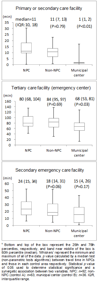 Figure 3 shows driving time (minutes) to each type of health facility of a NPC and two types of control community. The respective median driving times of NPCs, non-NPCs and municipal centers were 11 minutes, 11 minutes, and 1 minute to a primary or secondary care facility; 80 minutes, 84 minutes, and 68 minutes to a tertiary care facility; and 24 minutes, 18 minutes, and 15 minutes to a secondary emergency care facility, respectively. Municipal centers had a significantly shorter driving time to a primary clinic or secondary hospital than NPCs and non-NPCs. The difference in driving time between NPC and non-NPC, however, was not observed in all types of medical facilities.