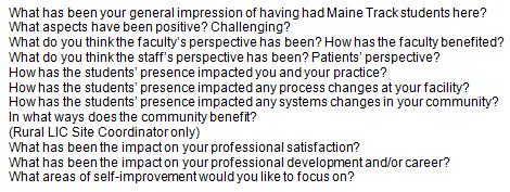 Nine physician leaders (ie the Chief Medical Officer and/or the LIC site coordinator) of the five rural Maine hospital sites were included for the interviews. These physicians were integrally involved in the establishment and operation of the LIC at their respective site. Each rural site had completed at least one cycle of students participating in the LIC program, with 2-4 students at each site. For the faculty preceptor survey, 84 physicians were identified in these five rural sites.