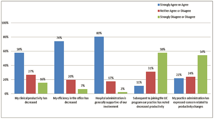 This concern was mirrored in the preceptor survey, which found that most preceptors noted a decline in clinical productivity and efficiency as a result of participating in the LIC. Most preceptors, however, also felt that the practice and hospital administration were supportive of their involvement and that overall office productivity had not declined (Fig2).