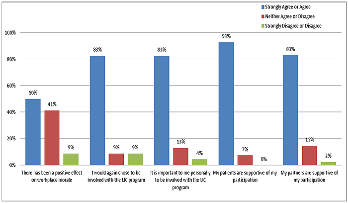 The benefits of the LIC as perceived by the rural LIC preceptors were also evident in the LIC preceptor survey. Most preceptors noted an increase in professional and overall job satisfaction as well as an improvement in clinical skills and medical knowledge (Fig4).