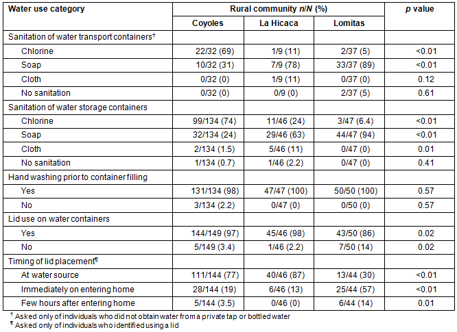 In the article 'Water sanitation, access, use and self-reported diarrheal disease in rural Honduras' a questionnaire completed by 263 randomly selected adults attending a June 2011 medical brigade revealed differences in the examined variables between the geographically distinct communities of Coyoles, La Hicaca, and Lomitas located in the rural Department of Yoro area of Honduras3. Unpublished data from this same study was analyzed to evaluate the sanitation of containers for water transport and storage, use of lids on containers, and hand washing prior to container filling between these same communities. P values were computed to determine significant differences both between variables (when all responses from all surveyed individuals were considered) and communities using the three-way χ2 and Fisher's exact tests.