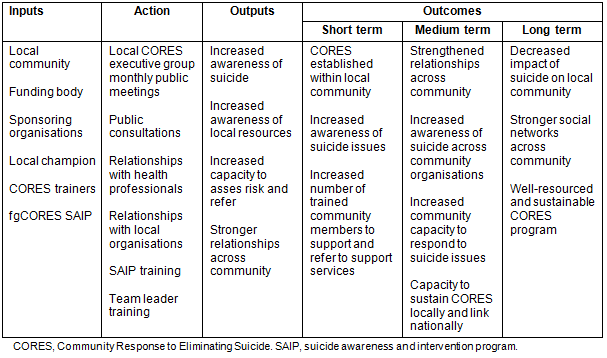 The CORES suicide awareness and intervention program was developed in Sheffield, Tasmania in response to concern about the rising suicide rates in the rural regions of the state. The local region has few social and community services and suffers significant social disadvantage, with high unemployment, high youth unemployment, a high incidence of diabetes, obesity, smoking and the lowest life expectancy in the state18. The program was conceived as a holistic approach to suicide awareness that involved building local leadership and social networks to find solutions to improve the general health and wellbeing of the whole community. The aims of the program were to (i) gather local people in the community to examine and understand their community, (ii) foster an understanding of suicide, (iii) develop the skills of local people to identify and respond to suicide at an early stage, (iv) engage local people in the delivery of the program, (v) identify and link people to community and professional support services and (vi) empower the local community to own and manage the program. The explicit adoption of a community-based approach19 for CORES infused the rationale, development and delivery of the overall program.