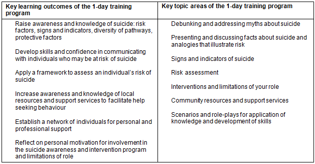 The aim of the 1-day SAIP is to increase the ability of local community members to identify people at risk of suicide, assess the immediate risk of suicide through structured conversation and facilitate help-seeking behaviour through identification of support services. The outcomes and content of the 1-day SAIP (Table 2) is consistent with best practice guidelines19 and those espoused in the Australian LIFE (Living is for Everyone) framework20. The SAIP is delivered by two team leaders to a small group of 10-15 participants in a manner that draws upon lived experiences and promotes active participation.